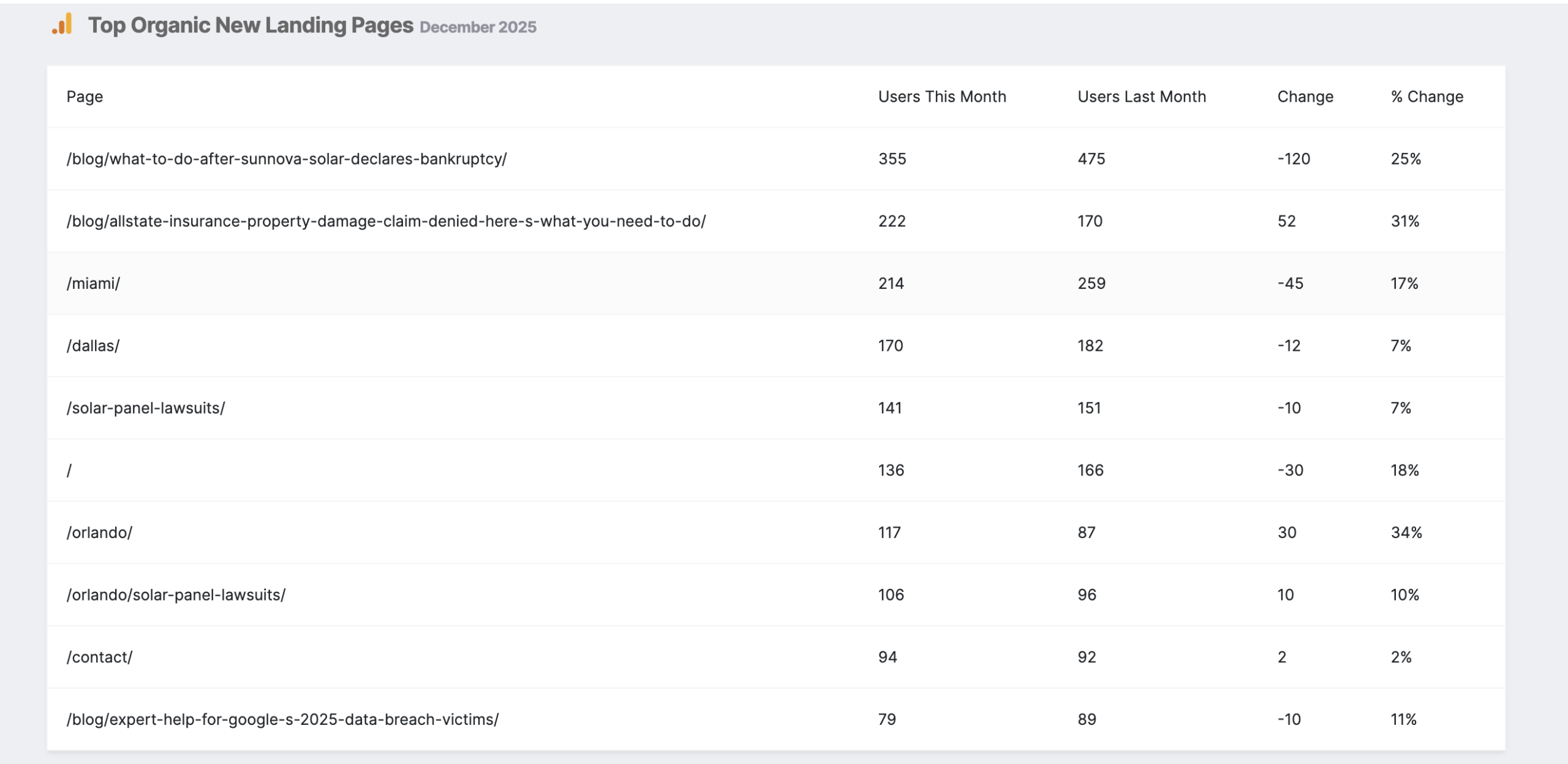Snapshot of organic blog performance from GA4 (Google Analytics, showing top pages and month-over-month movement. Included to highlight results in addition to design deliverables.